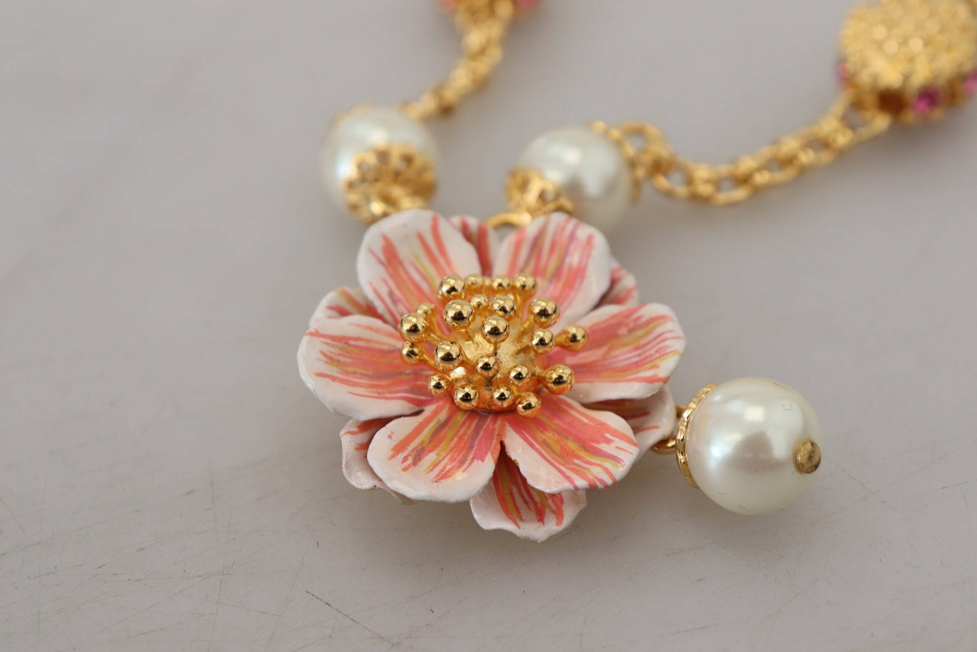 Dolce & Gabbana Gold Tone Floral Crystals Pink Embellished Necklace