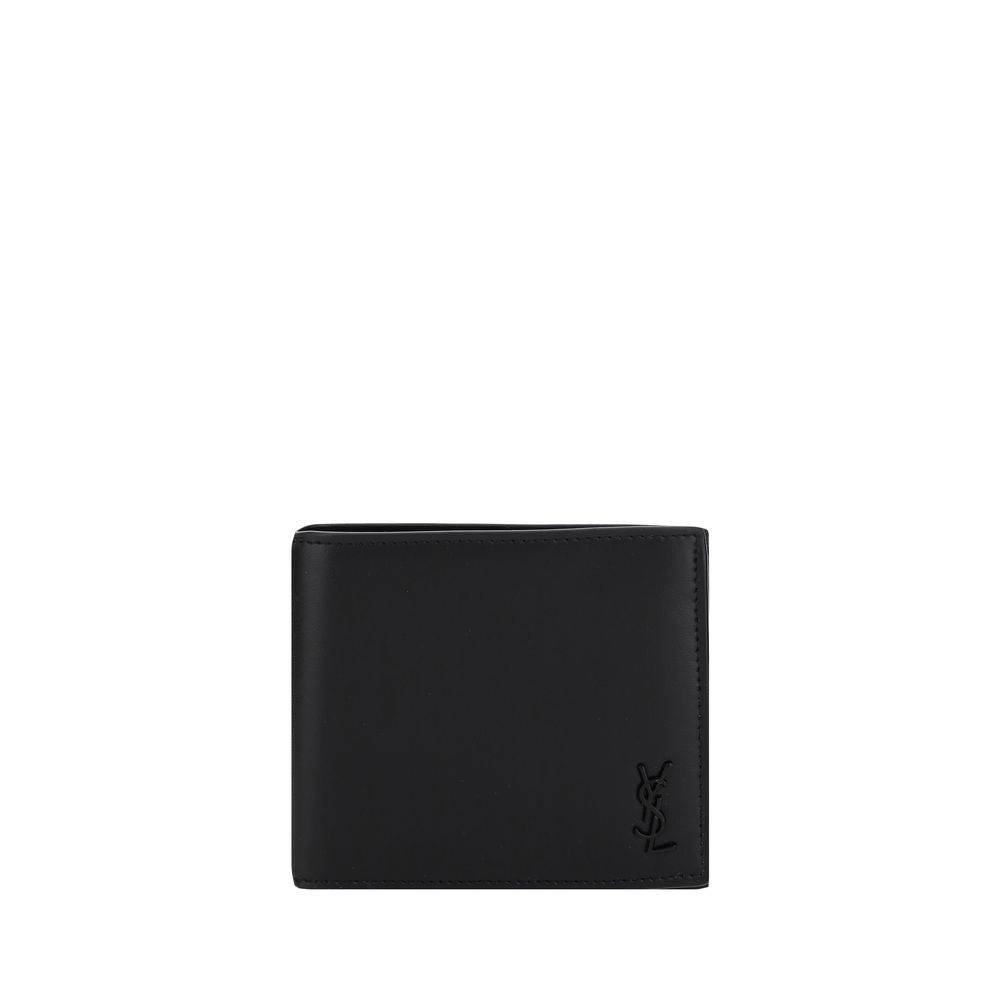 Calfskin Wallet by Saint Laurent, logo plaque on front, bill fold design, internal card slots and bill compartments.